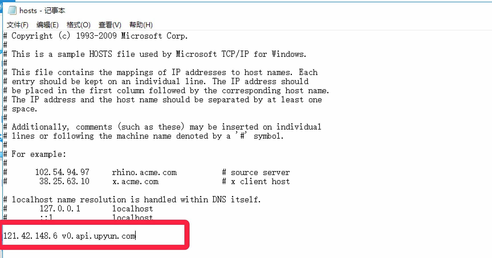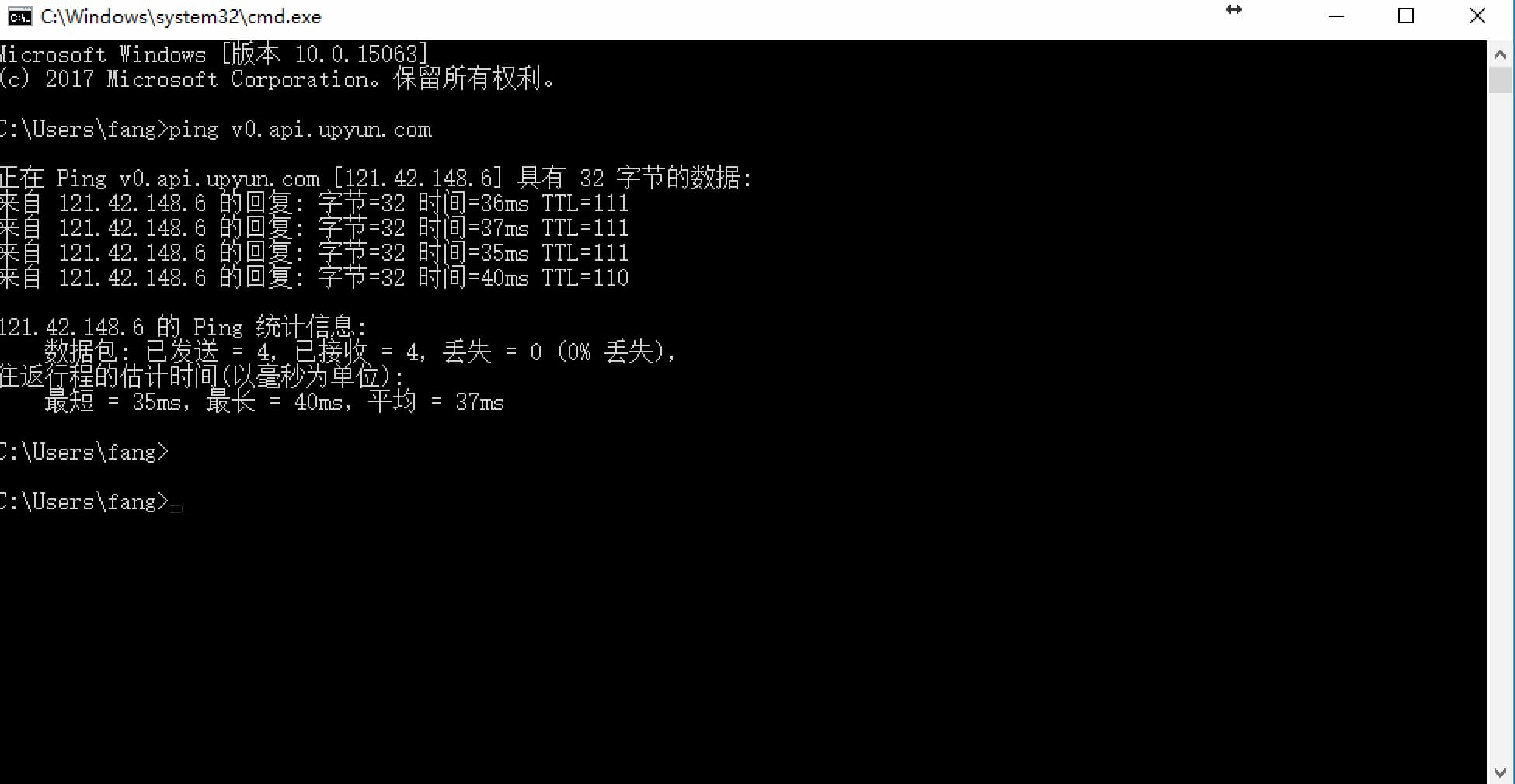 然后输入 ping v0.api.upyun.com 验证IP是否是刚才写在 hosts 文件中的。