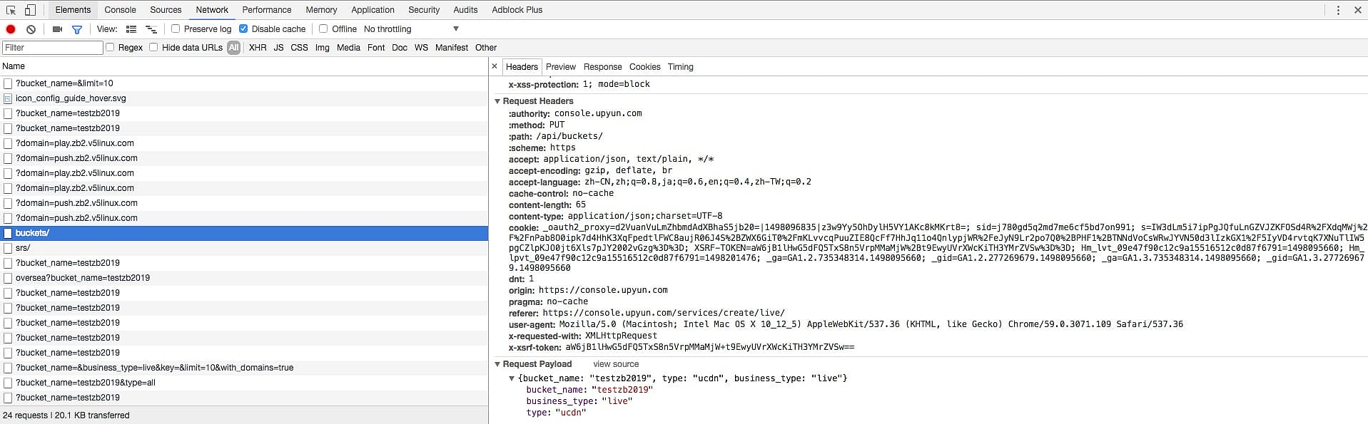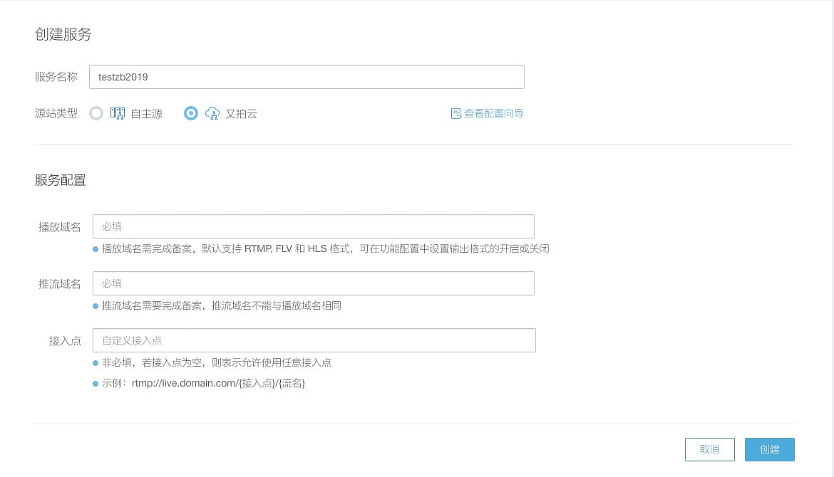 此外,你可以去后台打开控制台,创建与接口相对于的功能,看下调用的接口和传的数据是什么,这样更方便你熟悉接口的参数是如何传的。打个比方,我现在要创建一个又拍云源模式的直播服务。