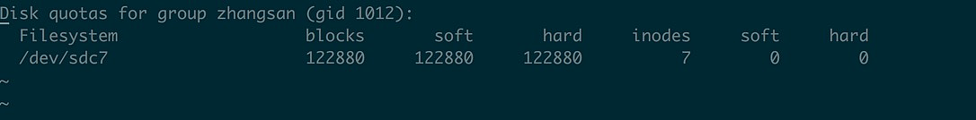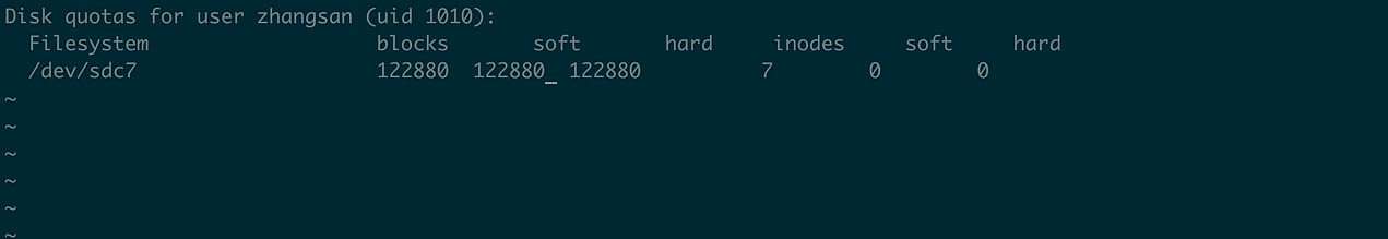 [root@localhost mnt]# edquota -u zhangsan Disk quotas for user zhangsan (uid 1010): Filesystem blocks soft hard inodes soft hard /dev/sdc7 0 0 0 0 0 0
