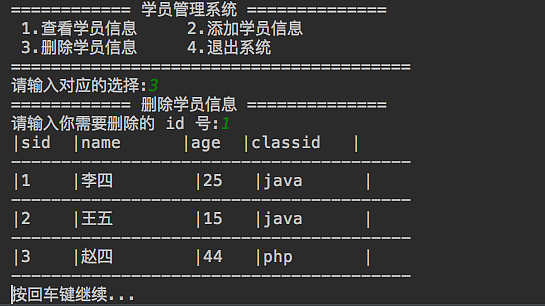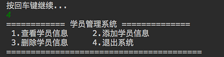 if key == "1": print("="*12,"学员信息浏览","="*14) input("按任意键继续...") elif key == "2": print("="*12,"学员信息添加","="*14) input("按任意键继续...") elif key == "3": print("="*12,"删除学员信息","="*14) input("按任意键继续...") elif key == "4": print("=" * 12, "退出系统", "=" * 14) break else: print("="*12,"无效的键盘输入","="*14)