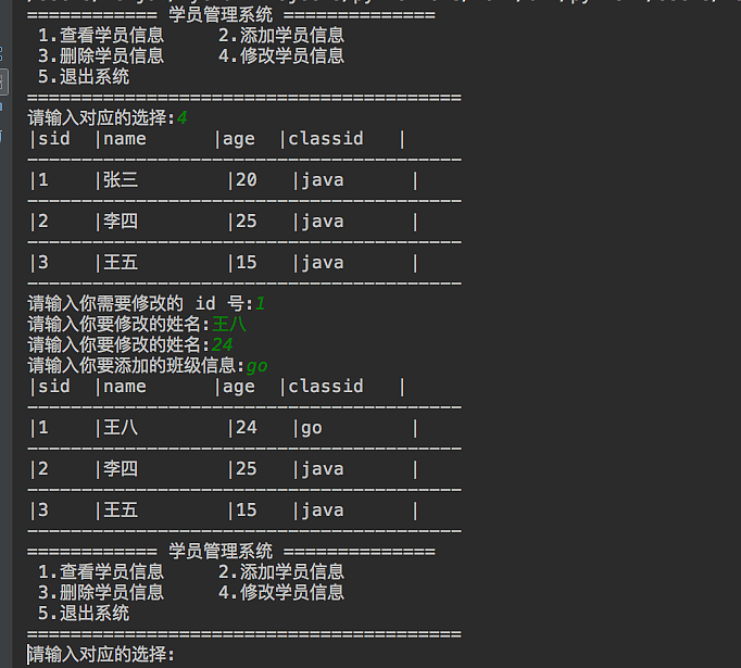 elif key == "4": showStu(stulist) sid = int(input("请输入你需要修改的 id 号:"))-1 stulist[sid]["name"] = input("请输入你要修改的姓名:") stulist[sid]["age"] = input("请输入你要修改的姓名:") stulist[sid]["classid"] = input("请输入你要添加的班级信息:") showStu(stulist)
