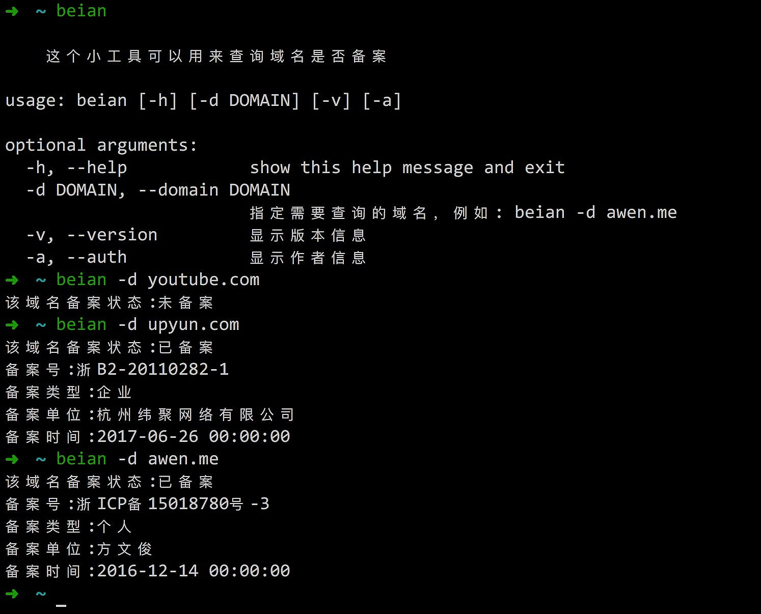 if len(sys.argv) == 1: sys.argv.append('--help') APP_DESC = """ 这是一个提升工作效率的小工具 """ print(APP_DESC) parser = argparse.ArgumentParser() parser.add_argument('-d','--domain',dest="domain",help="指定需要查询的域名,例如: ba -d awen.me") parser.add_argument('-v','--version',dest="version",help="显示版本信息",action="store_true") parser.add_argument('-i','--ip',dest="ip",help="查询 IP 归属地,例如 ba -i 123.234.1.1") parser.add_argument('-a','--auth',dest="auth",help="显示作者信息",action="store_true") parser.add_argument('-u','--update',dest="update",help="升级程序",action="store_true")