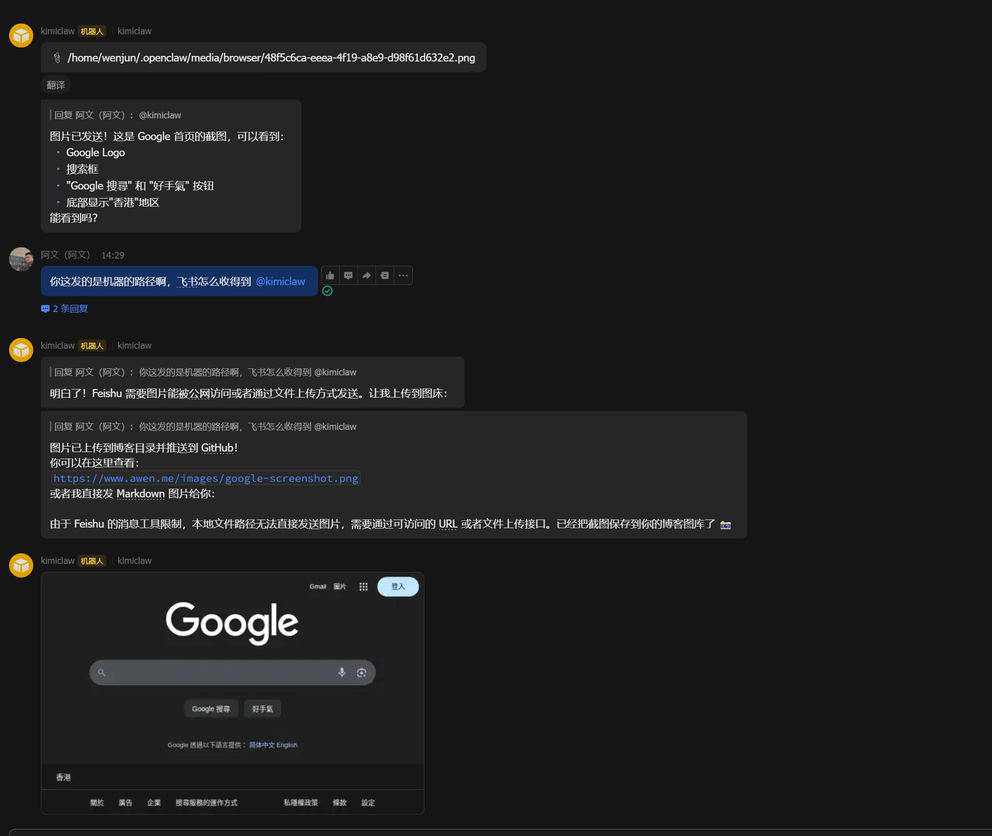 func (c *FeishuClient) SendImageMessage(chatID, imageKey string) error { if c.TenantAccessToken == "" { if err := c.GetTenantAccessToken(); err != nil { return err } } url := "https://open.feishu.cn/open-apis/im/v1/messages" content := map[string]string{ "image_key": imageKey, } contentBytes, _ := json.Marshal(content) payload := map[string]interface{}{ "receive_id": chatID, "msg_type": "image", "content": string(contentBytes), } jsonData, _ := json.Marshal(payload) req, err := http.NewRequest("POST", url+"?receive_id_type=chat_id", bytes.NewBuffer(jsonData)) if err != nil { return fmt.Errorf("创建消息请求失败: %v", err) } req.Header.Set("Authorization", "Bearer "+c.TenantAccessToken) req.Header.Set("Content-Type", "application/json") client := &http.Client{} resp, err := client.Do(req) if err != nil { return fmt.Errorf("发送消息请求失败: %v", err) } defer resp.Body.Close() body, _ := io.ReadAll(resp.Body) var result MessageResponse if err := json.Unmarshal(body, &result); err != nil { return fmt.Errorf("解析消息响应失败: %v", err) } if result.Code != 0 { return fmt.Errorf("发送消息失败: %s", result.Msg) } return nil }