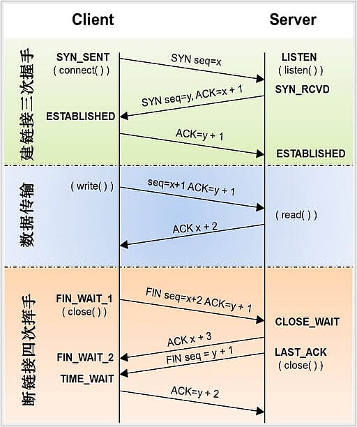 - 第一次握手:建立连接。客户端发送连接请求报文段,将SYN位置为1,Sequence Number为x;然后,客户端进入SYN_SEND状态,等待服务器的确认;