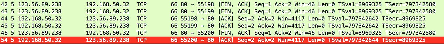 - 客户端收到后回复主机106.11.47.20一个[ACK],至此建立完三次握手,然后就看到了 HTTP 的 GET 请求了。