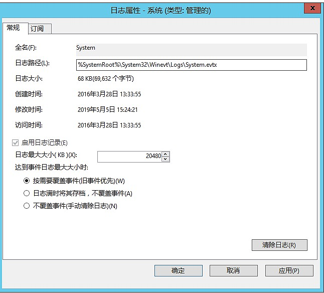 4.将达到日志事件大小适选择为 「按需要覆盖事件日志」。
