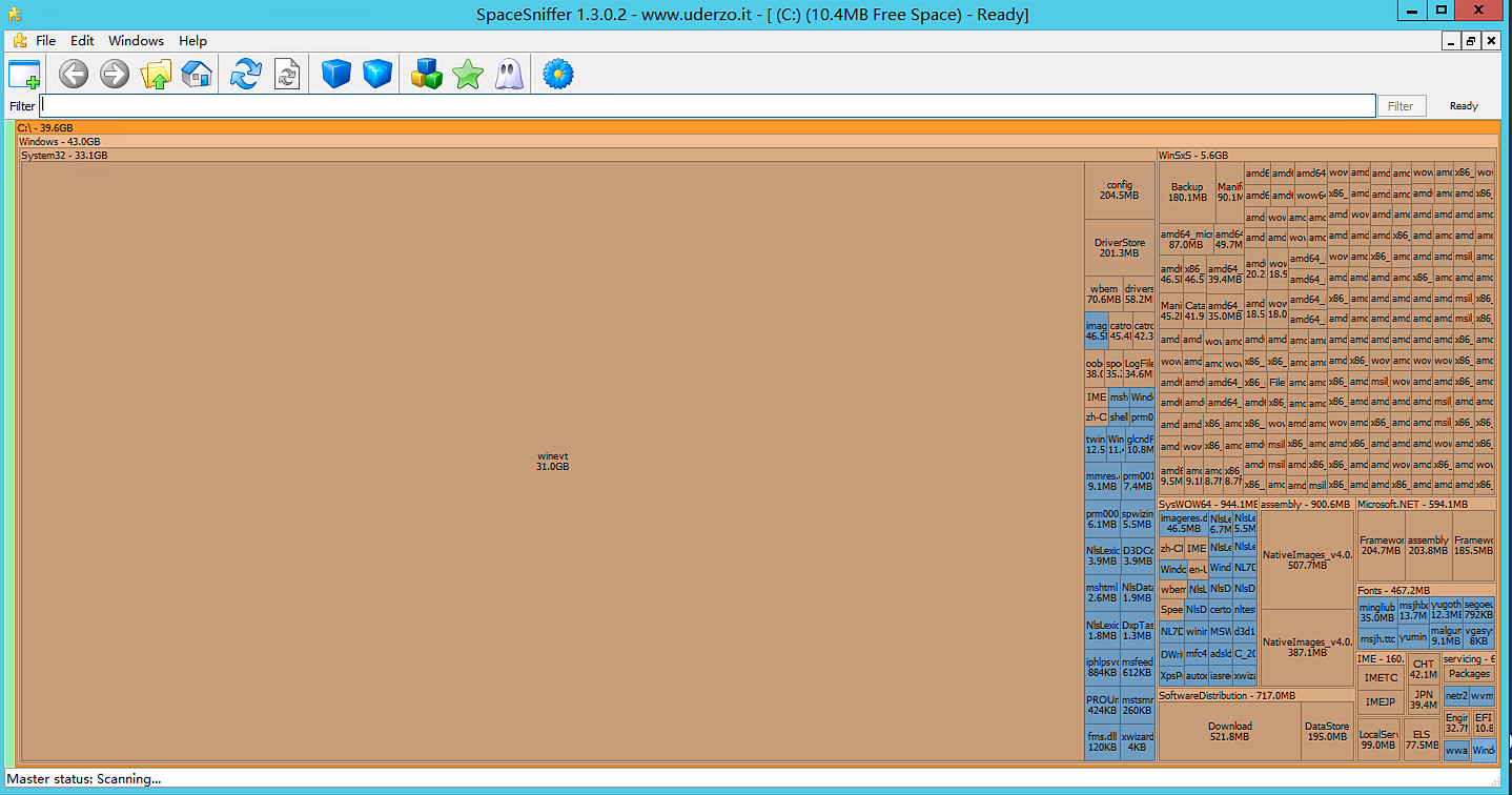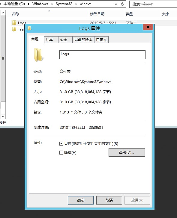 如图所示,显示winevt目录占用了31G,winevt是系统事件日志存储的目录,因此确认是否是被事件日志占满了
