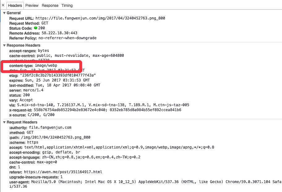 1.首先,第一种方式是查看图片的 response 头信息中的 content-type 字段,如果字段中带有 image/webp 就表示该图片是 webp 的格式,你可以试试把这个图片的 url 放到 Safari 访问试试。