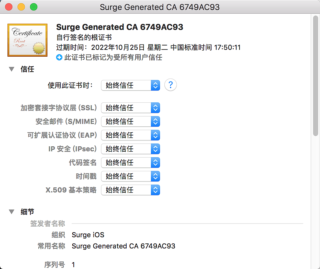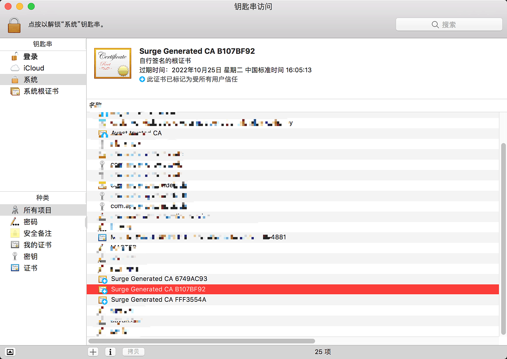 4.打开钥匙串,找到Surge的证书