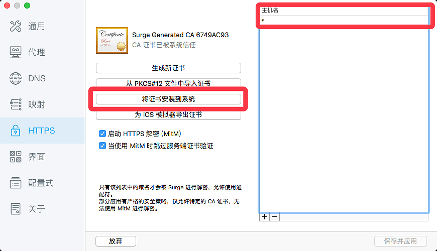 2.切换到 HTTPS,生成证书后将证书安装到系统,并且添加主机名为 * 或你希望抓取的域名