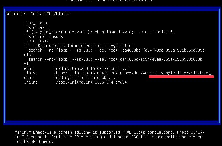 4.编辑kernel那行最后面的 内容从 ro 到 quit 都删掉, 改成 rw single init=/bin/bash,按crtl+x 执行重启