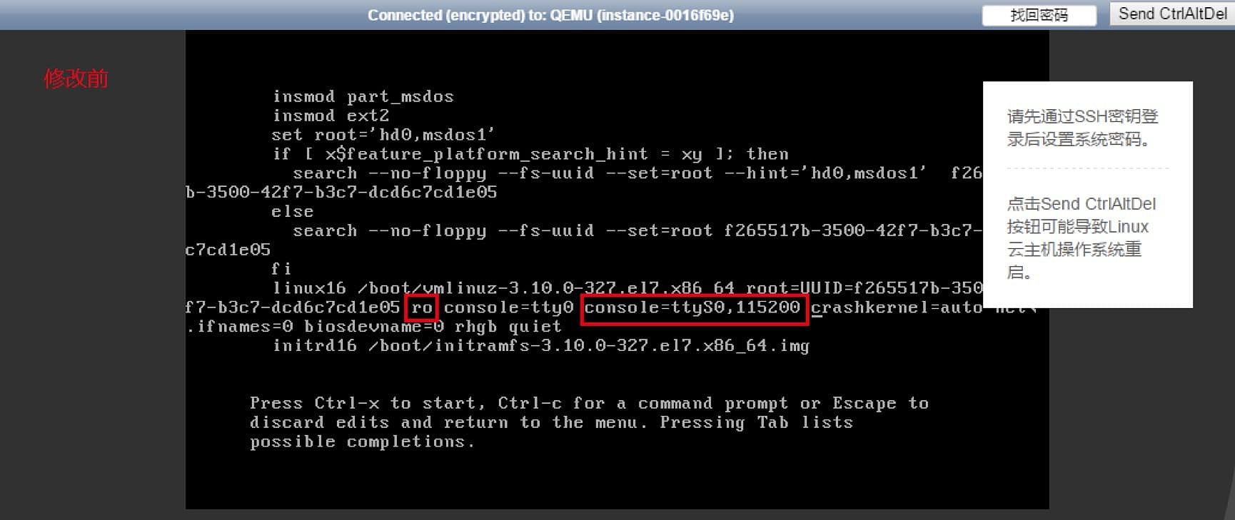 都会导致必须通过控制台 VNC 进行登陆系统后修改配置,但是假设用户忘记设置 root 密码或是遗忘了密码就需要进入单用户模式进行密码的重置了。