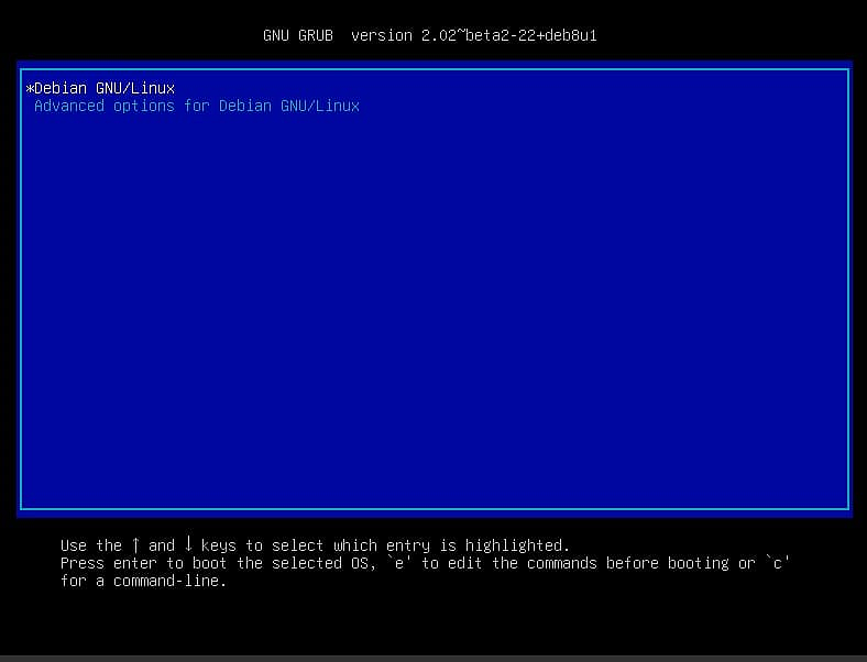 3.重启后,在grub选项菜单’Debian GNU/Linux’,按e进入编辑模式