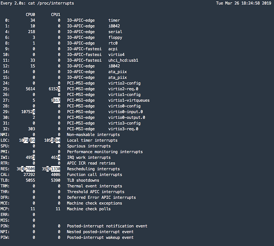 观察一段时间,你可以发现,变化速度最快的是重调度中断(RES),这个中断类型表示,唤醒空闲状态的 CPU 来调度新的任务运行。这是多处理器系统(SMP)中,调度器用来分散任务到不同 CPU 的机制,通常也被称为处理器间中断(Inter-Processor Interrupts,IPI)。