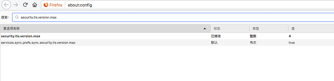 Firefox,将 about:config 中的 security.tls.version.max 改为 4;
