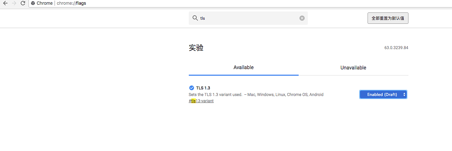 Chrome,将 chrome://flags/ 中的 Maximum TLS version enabled 改为 TLS 1.3(Chrome 62 中需要将 TLS 1.3 改为 Enabled (Draft)