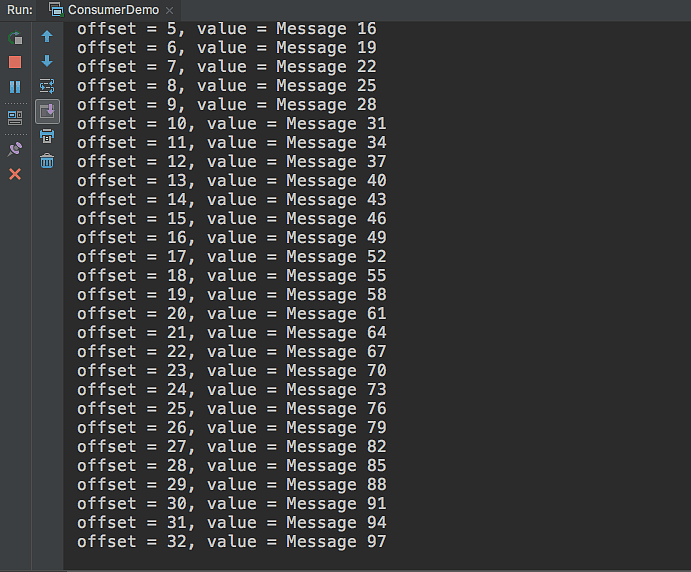 KafkaConsumer<String, String> kafkaConsumer = new KafkaConsumer<>(properties); kafkaConsumer.subscribe(Arrays.asList("test")); while (true) { ConsumerRecords<String, String> records = kafkaConsumer.poll(100); for (ConsumerRecord<String, String> record : records) { System.out.printf("offset = %d, value = %s", record.offset(), record.value()); System.out.println(); } }