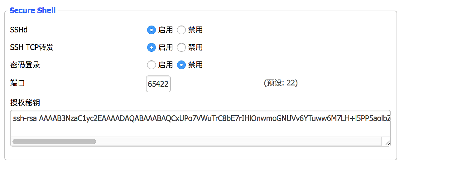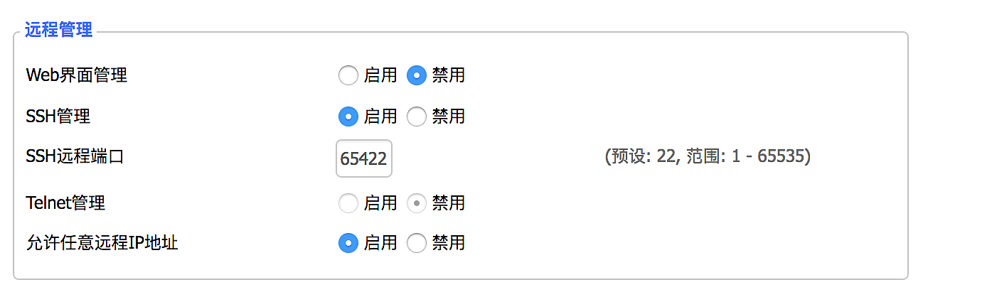 保存并应用,然后切换到管理开始 SSH管理,关闭 telnet 管理,因为telnet 是明文传输不安全,端口随便设置一个,尽量不要用默认的。
