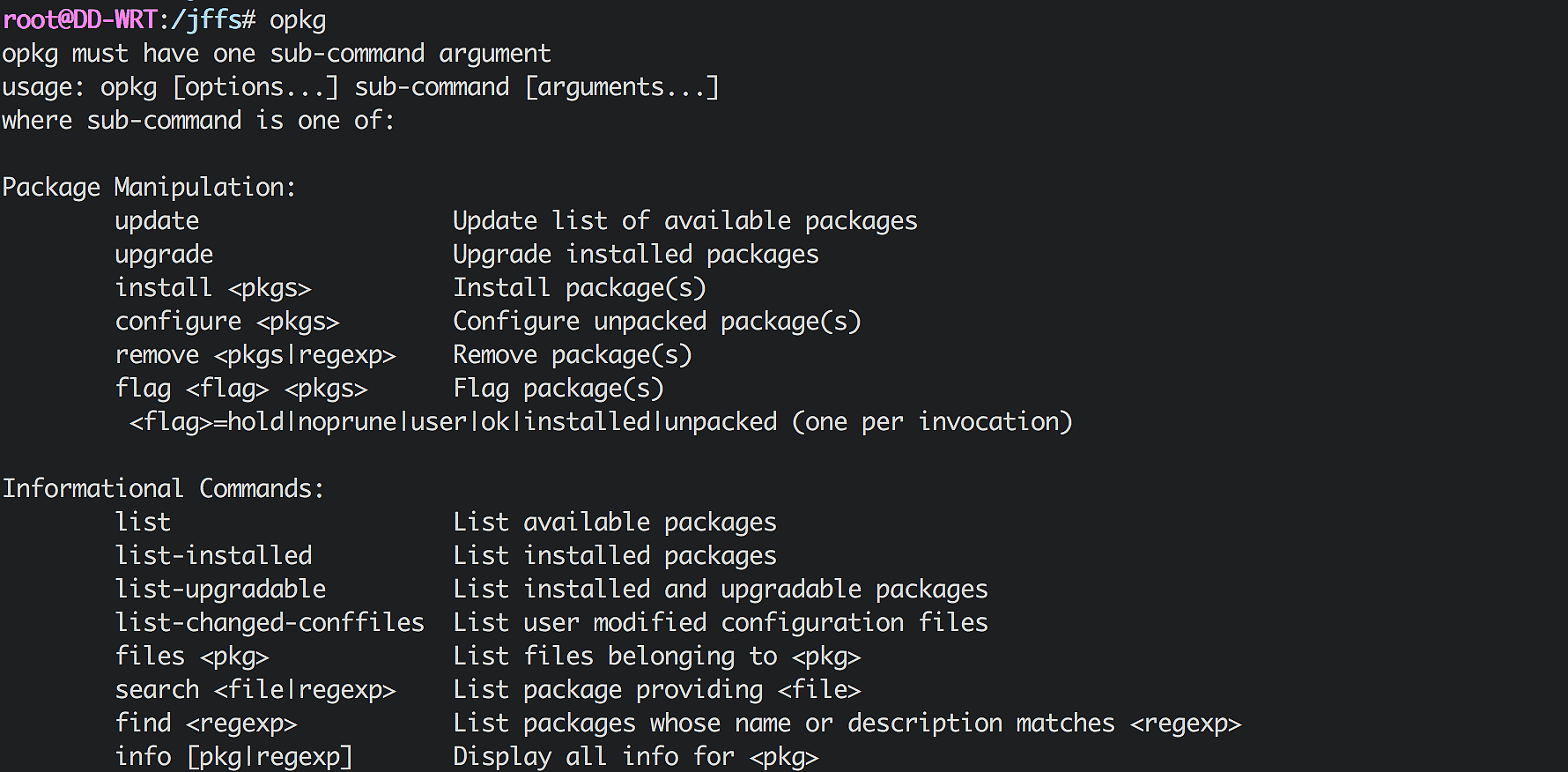 安装完毕,执行 opkg,可以看到如图所示的命令参数则说明安装成功