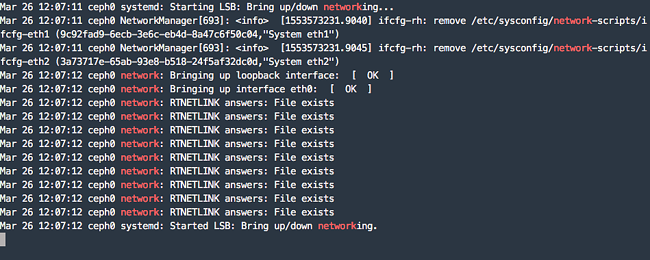 [root@ceph0 ~]# tail -f /var/log/messages|grep network Mar 2612:05:06 ceph0 systemd: Starting LSB: Bring up/down networking... Mar 2612:05:06 ceph0 network: Bringing up loopback interface: [ OK ] Mar 2612:05:06 ceph0 network: Bringing up interface eth0: [ OK ] Mar 2612:05:06 ceph0 network: Bringing up interface eth1:Error: Connection activation failed: No suitable device found for this connection. Mar 2612:05:06 ceph0 network: [FAILED] Mar 2612:05:06 ceph0 network: Bringing up interface eth2:Error: Connection activation failed: No suitable device found for this connection. Mar 2612:05:06 ceph0 network: [FAILED] Mar 2612:05:06 ceph0 network: RTNETLINK answers: File exists Mar 2612:05:06 ceph0 network: RTNETLINK answers: File exists Mar 2612:05:06 ceph0 network: RTNETLINK answers: File exists Mar 2612:05:06 ceph0 network: RTNETLINK answers: File exists Mar 2612:05:06 ceph0 network: RTNETLINK answers: File exists Mar 2612:05:06 ceph0 network: RTNETLINK answers: File exists Mar 2612:05:06 ceph0 network: RTNETLINK answers: File exists Mar 2612:05:06 ceph0 network: RTNETLINK answers: File exists Mar 2612:05:06 ceph0 network: RTNETLINK answers: File exists Mar 2612:05:06 ceph0 systemd: network.service: control process exited, code=exited status=1 Mar 2612:05:06 ceph0 systemd: Failed to start LSB: Bring up/down networking. Mar 2612:05:06 ceph0 systemd: Unit network.service entered failed state. Mar 2612:05:06 ceph0 systemd: network.service failed.