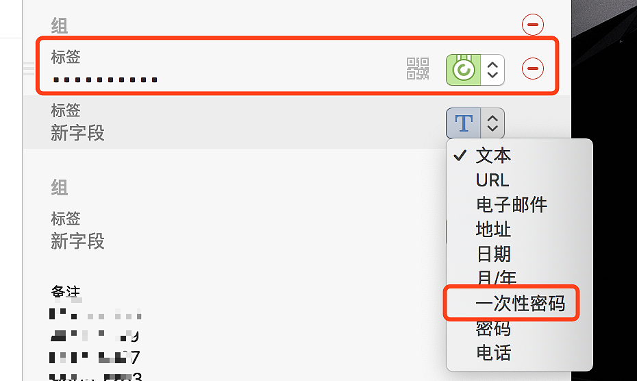 首先,编辑某个密码,然后选择一次性密码,当你选择后会有个二维码的标识