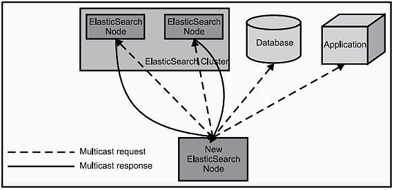当 ElasticSearch 的节点启动后,它会利用多播 (multicast) (或者单播,如果用户更改了配置) 寻找集群中的其它节点,并与之建立连接。这个过程如下图所示
