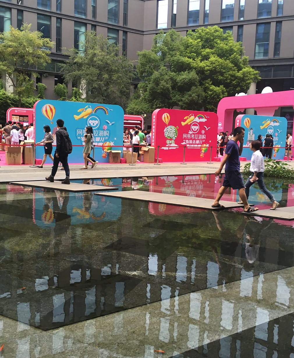 入职第一天中午,跟着部门新同事去食堂吃饭,这中间有个小插曲,早上报道的时候去食堂吃了个早饭,当天下着雨,网易门口有个大水池,邻着大门和 C 座周围没有任何的防护或提醒标记,下了雨地面和水池的颜色几乎一样,不熟悉地理环境的我一脚买进了水池,着实的尴尬,然后穿着湿鞋呆了一天。大写的囧!!