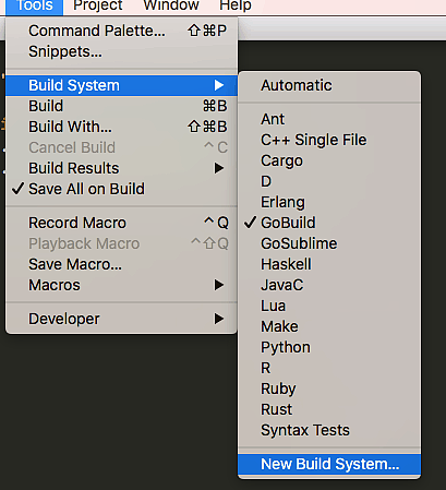 保存为 Gobuild.sublime-build,然后选择 Tools->Build System 选中GoBuild