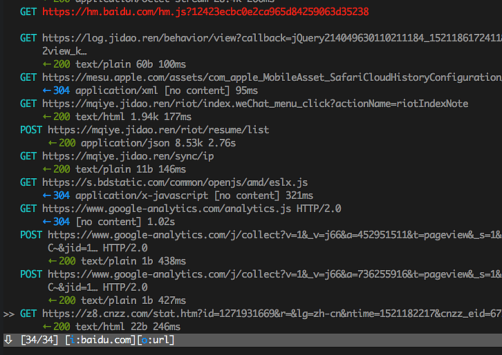 比如输入 baidu.com,则当请求到百度时候请求会被拦截并以橙色标识(颜色根据终端设置不一样会显示不一样)