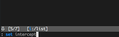 在请求列表界面按 i,在左下角会显示 Intercept filter:,要求输入过滤表达式,用于指示拦截哪些请求,此处的过滤表达式的语法同请求列表过滤表达式相同。