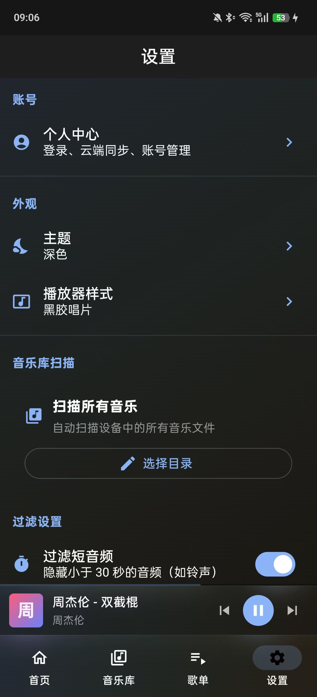 - 沉浸式播放页:黑胶唱片动画,歌词居中显示