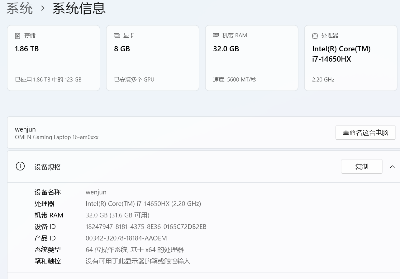 看起来配置当时很可以了,用了将近6年,但是最近感觉不是很好用了,我其实没啥打游戏的需求,但是之前跑ollama 6G显存啥也干不了,一直闲置,反正年限也长了。所以打算卖掉。今天扛着台式机丢到后备箱就去了颐高,1500 把机器卖掉了🤦♀️。换了一台惠普暗影精灵 11。以前一直使用Macbook pro 不得不说 MacBook 自从M1问世后,使用体验非常好,哪怕是跑程序风扇都不带转的,但是办理离职电脑上交手上就没有一台笔记本了,于是买上一台笔记本出门携带也方便。