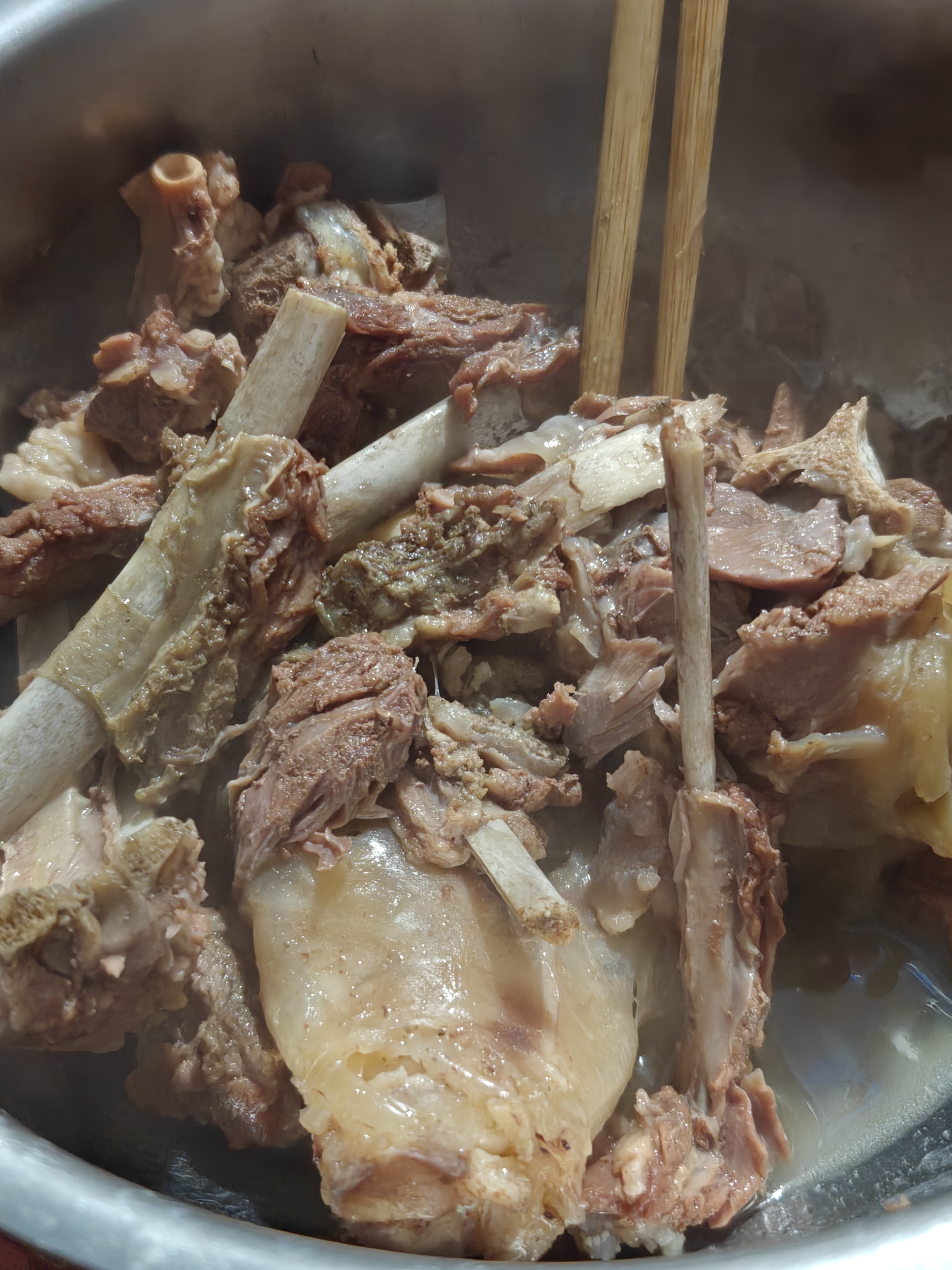 岳父家待客的最高规格是羊肉。清水煮,什么都不放,连盐都不加,就直接捞上来蘸着醋和辣子吃。我头一回见这种吃法,心里直打鼓——这能吃吗?结果尝了一口,居然很鲜美。肉嫩得很,而且一点都不膻。我后来才知道,民勤的羊是吃盐碱地里的草长大的,肉质本身就没什么膻味。我在杭州从来不吃羊肉,觉得那股味道受不了,但这几天在岳父家,居然也能吃上几块。