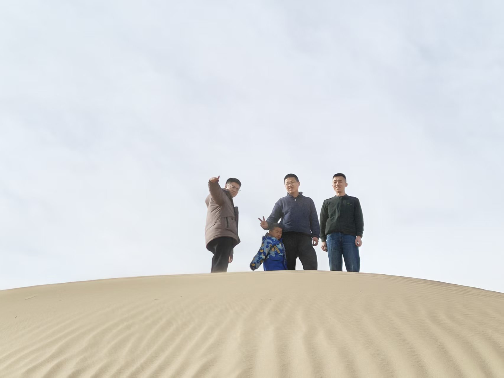 吃完饭,舅舅说带我们去附近逛逛。车子开出村子没多远,就是一片戈壁沙漠。脚踩在沙子上,软软地往下陷,走几步就累得气喘吁吁。儿子没见过真正的沙漠,兴奋得不得了,蹲在沙坡上玩沙子,抓一把扬起来,看风把沙粒吹散。远处几棵枯死的梭梭树,枝干扭曲着指向天空,有种苍凉的美感。